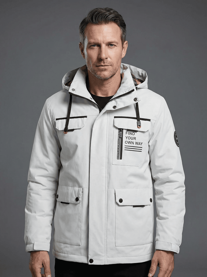 A modern, clean winter jacket featuring bold black details for a sharp contrast. Lightweight yet warm, this jacket delivers a crisp look with practical zip pockets for daily use.